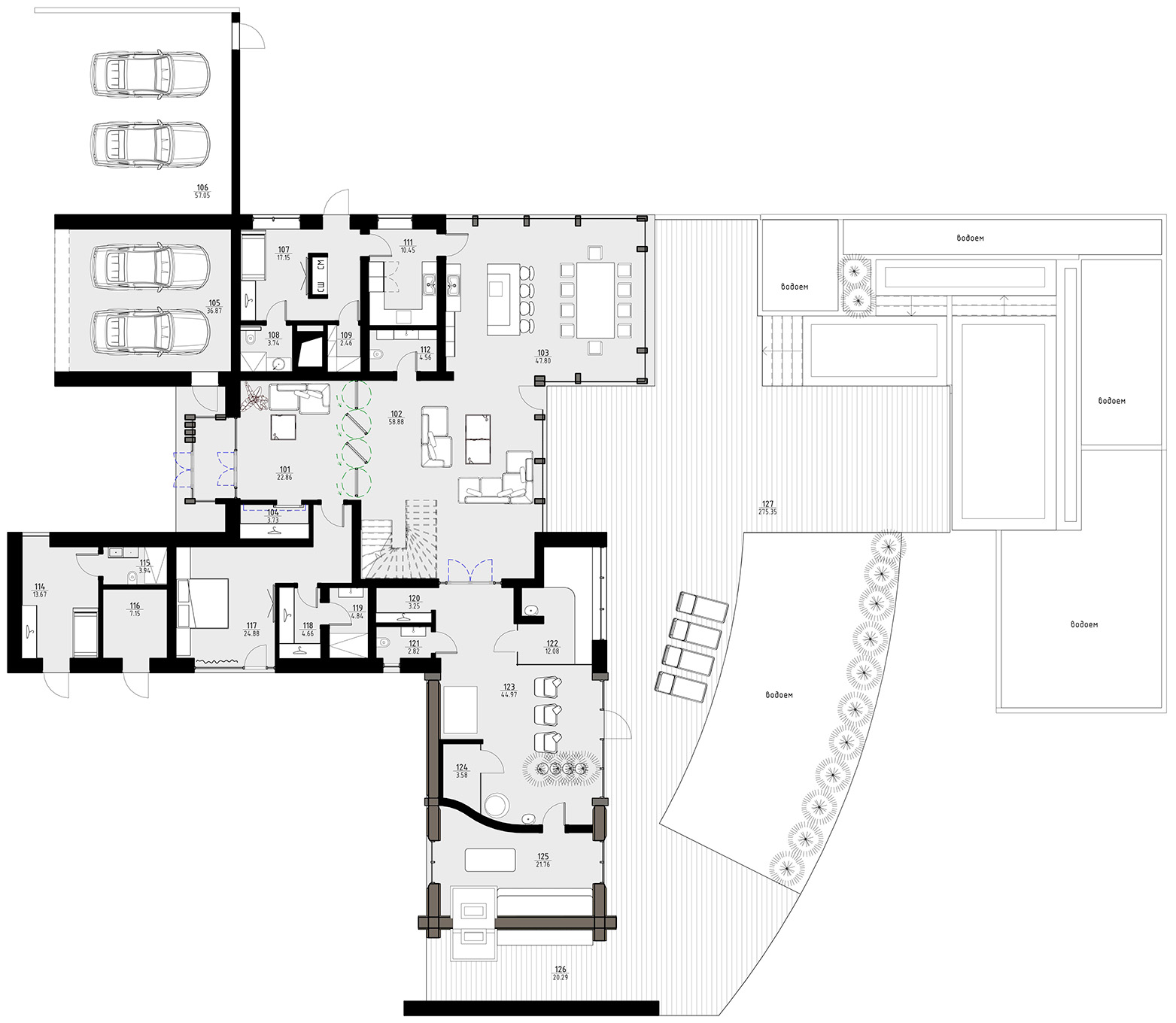 Для гостей, которые пришли только в спа-зону, к примеру, для друзей хозяина комплекса, предусмотрен также свой вход сразу в пространство с оздоровительными помещениями, где можно переодеться и насладиться отдыхом. Также отдельно хотелось бы рассказать про спа комплекс в нашем проекте. Представьте себе небольшой оазис, который располагается у вас в доме. В оазисе есть все необходимое для релакса, попадая в главное помещение мы попадаем в зону с панорамным остеклением, стены которого выполнены из многовекового кедра большого диаметра, здесь есть 4 удобных лежака для отдыха после процедур, отдельная душевая за стеклянной стеной, ледогенератор, а также купель с гидро и аэро массажем. Из основного помещения можно также попасть в арома-комнату, в которой можно насладиться восточными процедурами и оздоравливаться при помощи аромамасел и трав. Также помещение может быть использовано как хамам. В нашем комплексе предусмотрена собственная парная, которая может использоваться в разных сценариях — для парений и наслаждением ароматных веников с друзьями, либо для настоящих профессиональных мастер-парений с приглашенным парильщиком. Для него предусмотрено все для удобного проведения процедур.