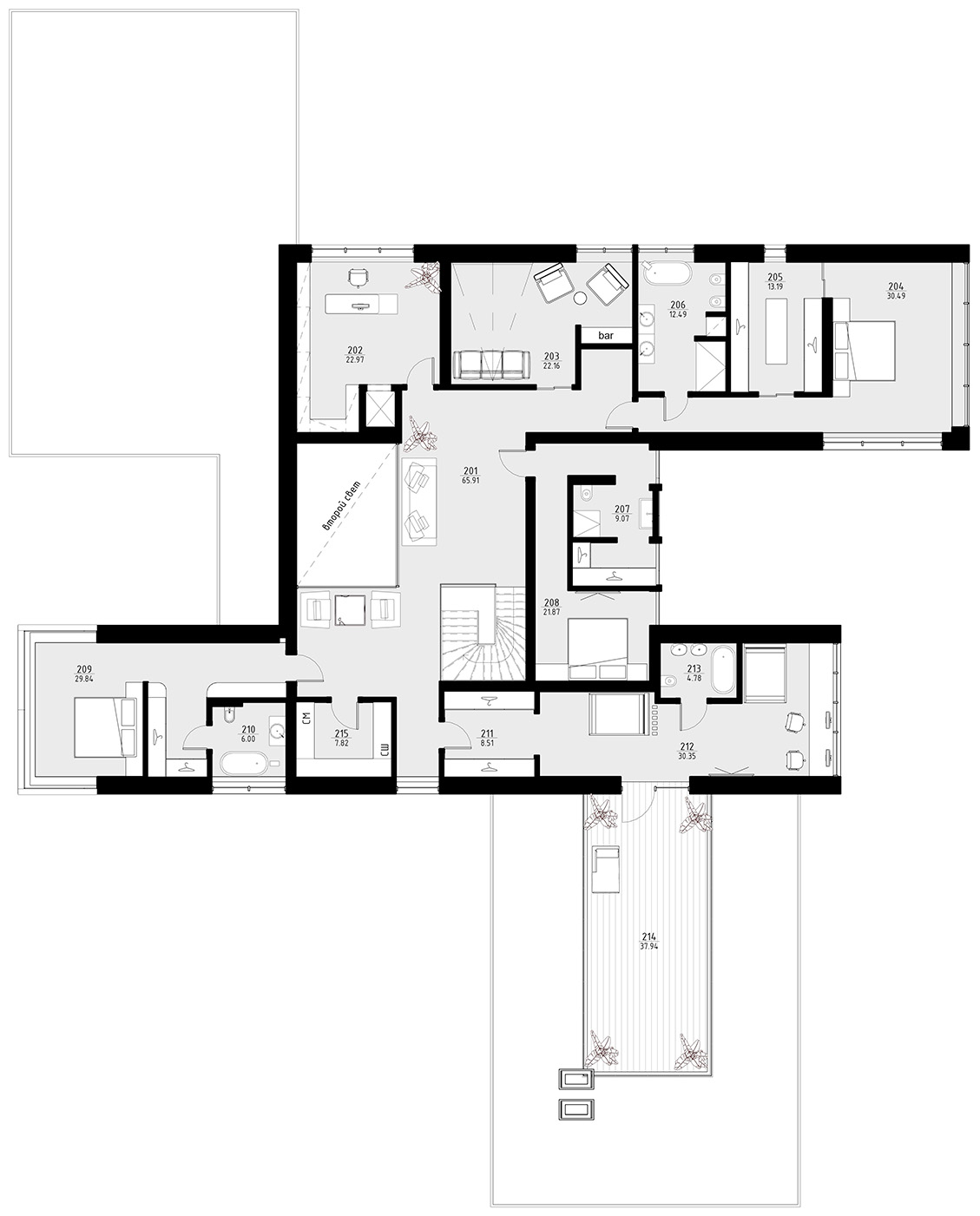 Один из мастер-блоков имеет собственный выход на эксплуатируемую кровлю спа-комплекса и является игровой зоной с безопасными ограждениями. В каждом мастер-блоке предусмотрена гардеробная и ванная с уникальным интерьером. Данный выход возможно будет расположен в мастер-спальне, мы ведем переговоры с заказчиком по расположению выхода.