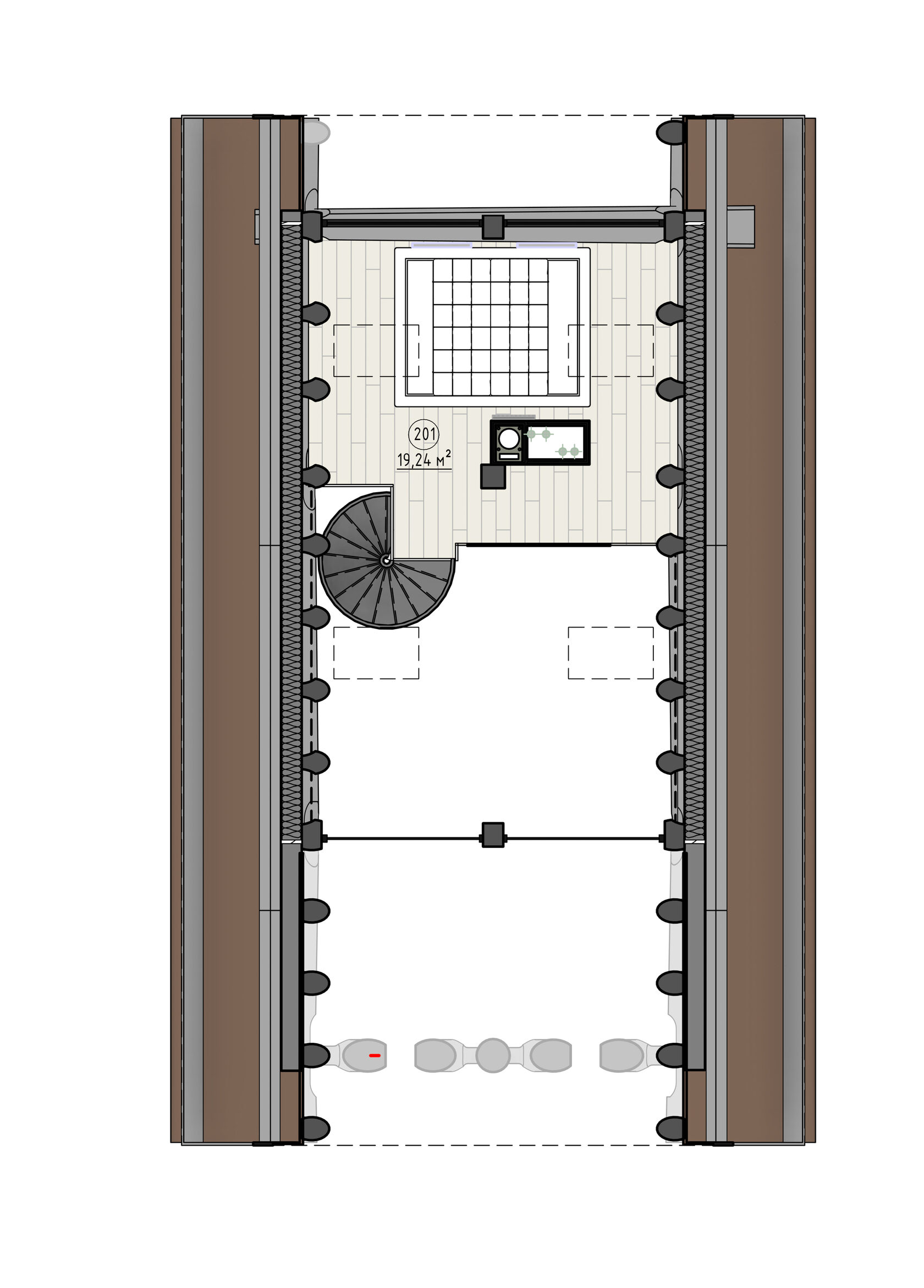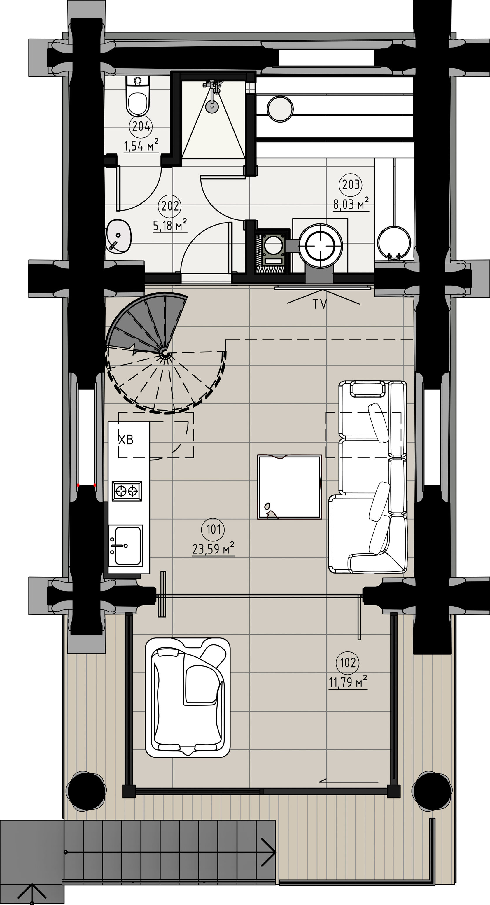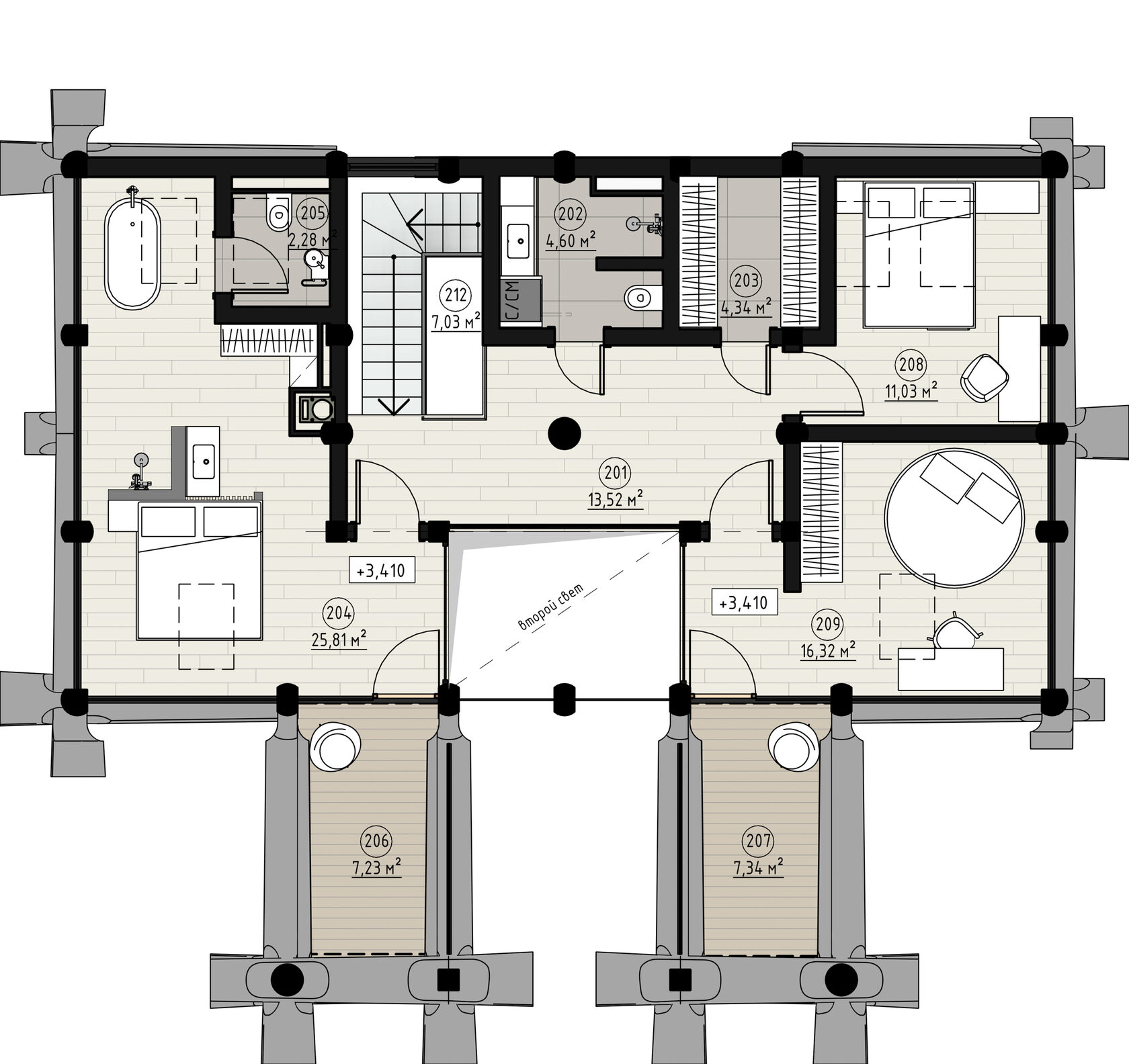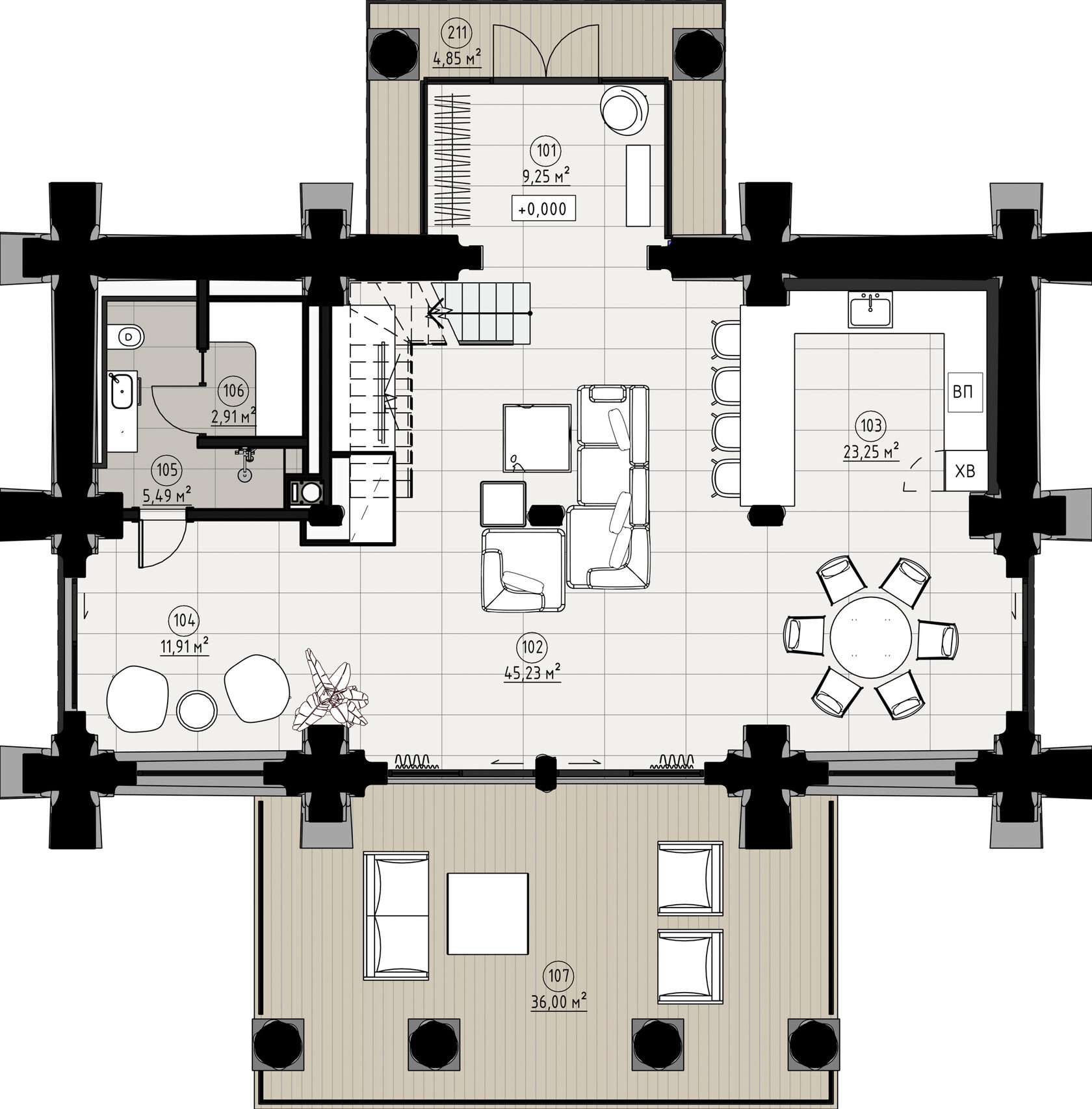 В планировочном решении учитывались все необходимые для хозяев факторы, мы умело вписали их в конструктив деревянного дома и бани. В проекте особое внимание было уделено инженерной оснастке: в доме и бане есть своя приточно-вытяжная система с увлажнением воздуха, система кондиционирования, а также адаптивная и автоматизированная система отопления и водоснабжения. Из-за высокого уровня радона в воде мы применили сложную многоуровневую систему фильтрации от лучших производителей на рынке.