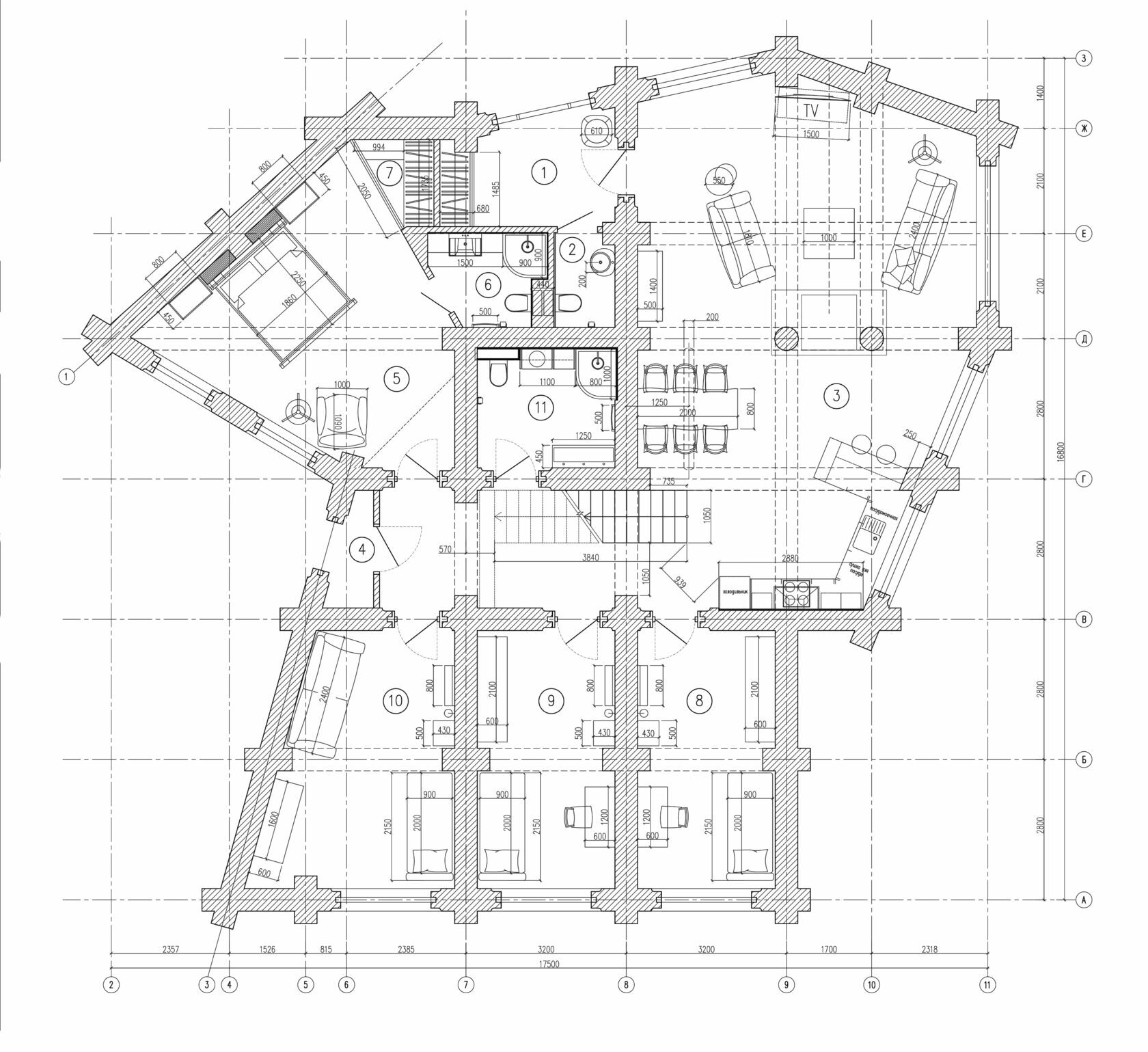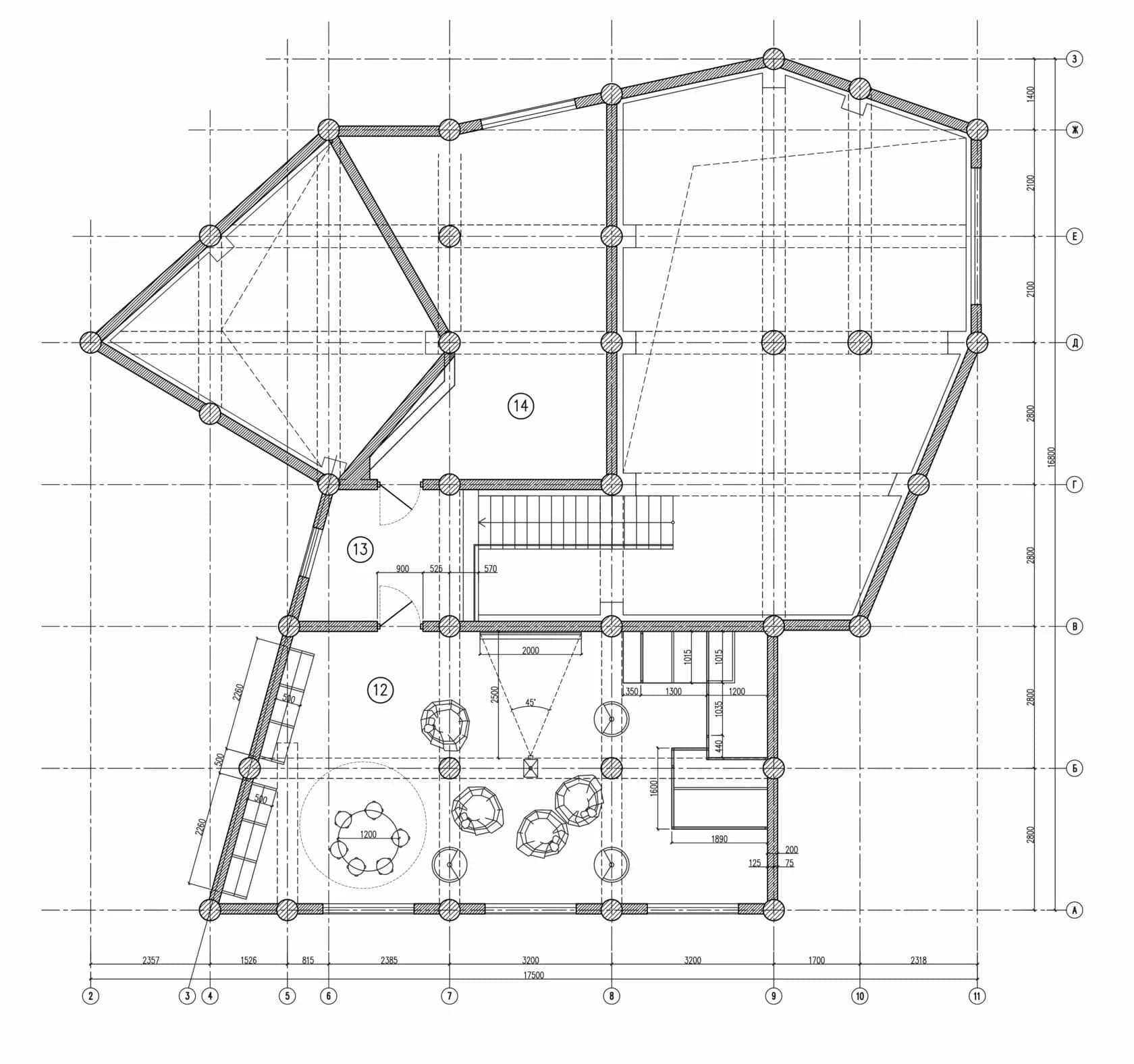 Участок расположен на склоне горы, скальное основание находится близко к поверхности, в нескольких местах на участке есть выходы скал. Перепад высот на участке более 5 метров. Залесенный рельеф требует особенного подхода к сохранению деревьев и защите корневых систем и почвы при строительстве. Использование при отсыпке участка специальных колец для защиты деревьев. Нестандартная и сложная реализация фундамента — необходимость монтажа основного дома на уже имеющийся на участке фундамент. Комбинированный основной дом: канадская рубка и мансардный этаж, выполненный по технологии POST&BEAM, цоколь облицован плитняком. Нестандартный абрис кровли — для каждого конструктивного слоя кровли разработаны детальные монтажные схемы. Просторная баня по технологии «Канадская рубка». Интересная планировка бани с комнатой отдыха, небольшим кинотеатром, зоной барбекю и отдельной топочной.